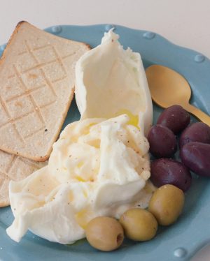 Queso fresco de leche de búfala de pasta hilada, rellena de stracciatella.